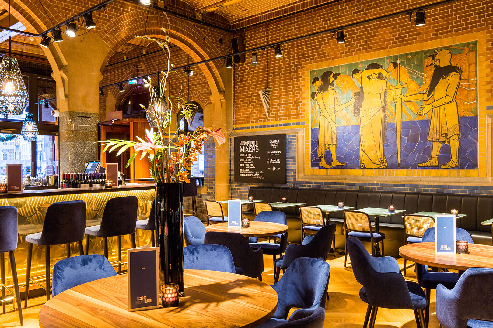 “The bistro’s history goes way back,” says marketing manager Willemijn de Vet. “Where you enjoy your lunch or dinner today, stockbrokers used to enter their temple to trade their way to success. The elegant brickwork and colourful tile tableaus against the walls, still remind us of the building’s rich history.” Together with the modern, elegant furniture and mesmerising golden bar in the centre, these elements give Bistro Berlage its unique and welcoming atmosphere. Outside, at its sun-drenched terrace at the dynamic Beursplein, you can gaze at Amsterdam’s diverse set of passengers for hours. With over 300,000 people passing the square every week, there is never a dull moment.